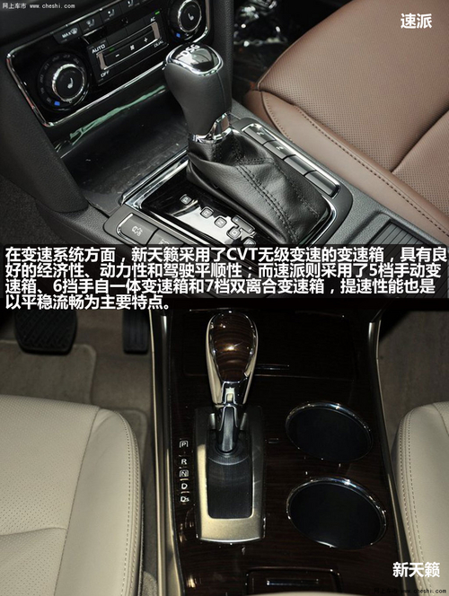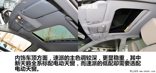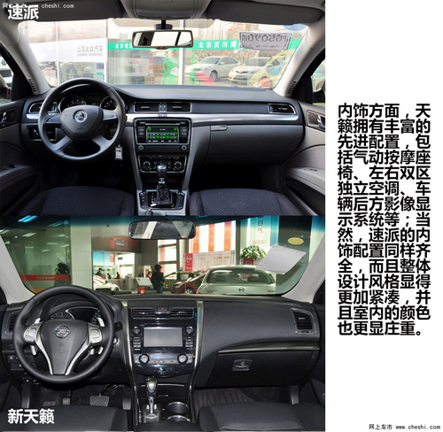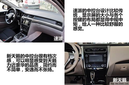 内饰方面,速派的内饰依然保持上海大众斯柯达的传统样式,仅仅在细节上做了一定程度的修改,总的来说变化不大。在用料上,中控台上侧覆盖以软质材料,手感不错;而新天籁黑色主体色辅以仿碳纤及银色装饰的内饰色彩搭配不仅让车内原本就比较细腻的工艺显得更加年轻,质感方面也更接近日产的高端品牌英菲 尼迪。