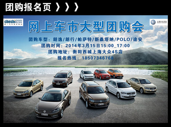 【网上车市衡阳站讯】朗逸既保持了德国设计的优秀品质,又融入了很多体现中国传统文化的审美观念以及站在时代前沿的设计元素。朗逸用充满前瞻性的设计语言为A级车注入了更多的豪华大气感。2014年3月15日15:00—17:00限时两小时,网上车市衡阳站组织西城上海大众团购会,朗逸现金优惠1000元,还送1000元保险、全国防爆膜、原厂脚垫、挡泥板等,当天现场进店签到有礼、订车更有抽奖礼,网上车市团购报名热线:18507346768。 您可拨打衡阳汽车团购24小时热线:18507346768咨询;也可发送短信(内容:姓名、车型、配置、颜色)报名;或加入衡阳购车团QQ群,群号:279772427。