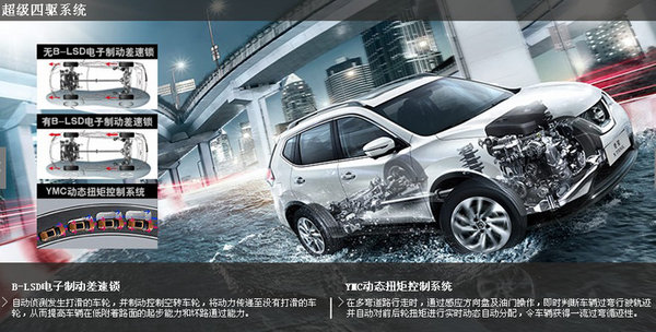 新势代奇骏采用4×4-i智能全模式四驱,具备2WD、LOCK、AUTO三种可自由切换的驱动模式,更多的选择空间和更强大的驱动水准,已经可以秒杀所有竞品的四驱系统。除此之外,新势代奇骏还配备了YMC动态扭矩控制系统、B-LSD电子制动差速锁、陡坡缓降控制系统、上坡辅助系统等尖端科技配置,形成了异常强大的超级四驱系统,让越野变得轻松自如,任何恶劣路况都能够从容应对。