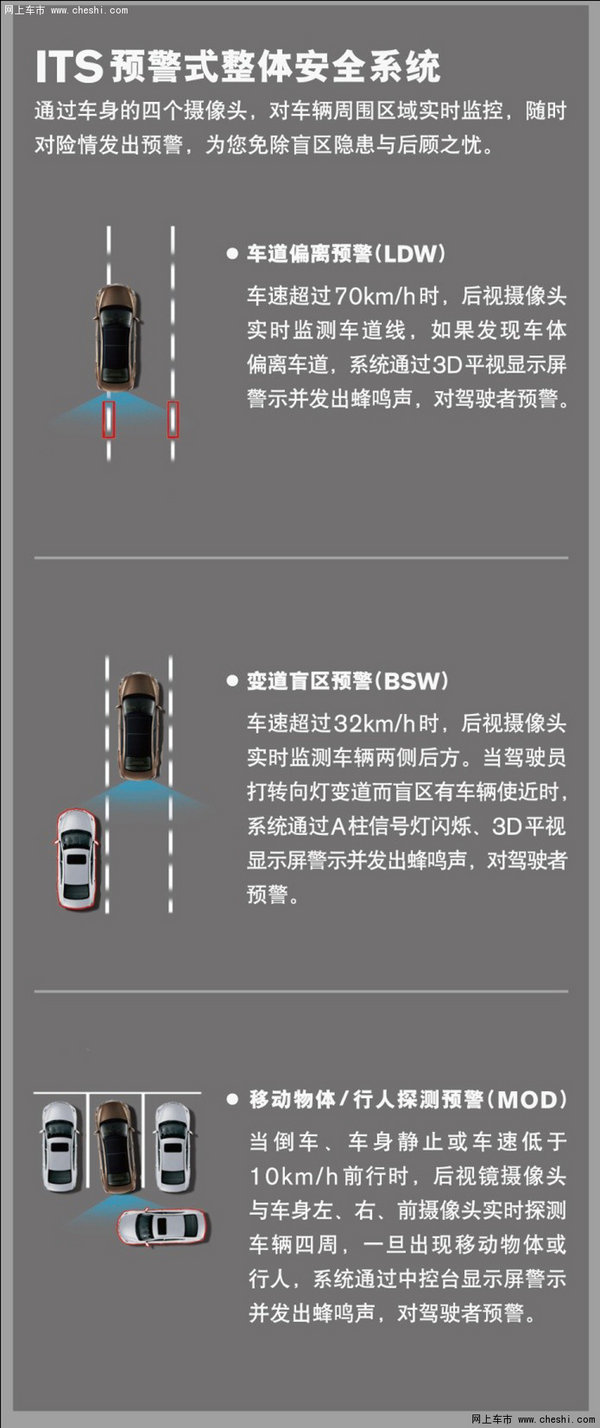 “ITS预警式整体安全系统”技术源于日产高端品牌英菲尼迪,可透过车身的四个摄像头,实时监测车辆四周3米范围内状况,提供变道盲区、车道偏离、行人探测三大预警,有效地避免变道危险和车道偏离,确保行车安全。