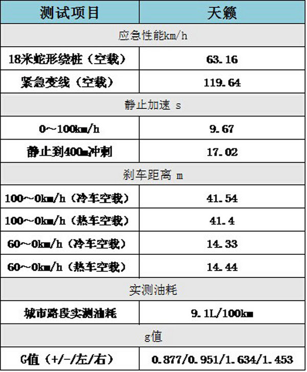 说到操控性,当然不得不提一下天籁的制动性能。在100~0公里/小时的制动测试中,天籁的实测成绩为41.5米,制动表现十分平和,紧急制动测试时的热衰减几乎不存在,制动状态始终如一。