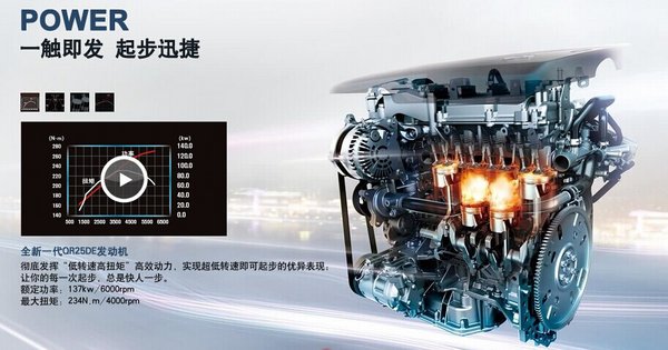 天籁的QR25DE直列四缸2.5升发动机的最大功率有137千瓦(186匹马力),扭矩为234牛·米,输出转速分别为6000转和4000转,基本达到了日产HR系列发动机,高转速调校的输出特性,让发动机变得很有活力。因此,即便是自然吸气形式,天籁的动力表现也十分充沛。