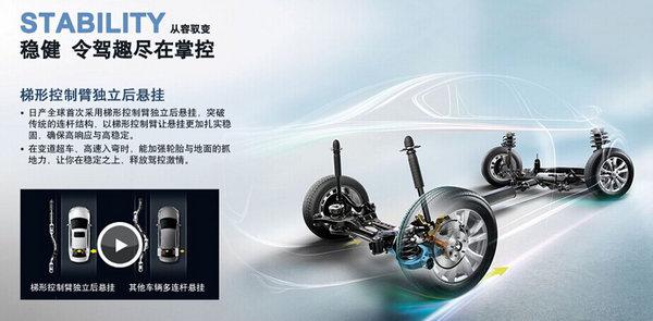 新天籁采用了“梯形控制臂独立后悬挂”,下控制臂是一个H形的梯形结构,上控制是一个连杆,这种上短下长的控制臂组合,使天籁在保持舒适的基础上,有效提升了悬挂的刚性。另外,天籁的后桥采用了随动转向技术,进一步增强了车尾的循迹性。