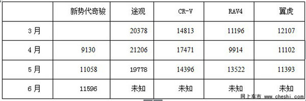以截取的3-6月销量样本来看,途观是城市SUV市场当之无愧的“一哥”,销量达到令人瞠目的2万台水准。以往与途观并驾齐驱的CR-V却出现滑坡的迹象,即便销量最高的4月,也难再现与途观旗鼓相当的高度,月均销量整体退居1.4万台。处在第二集团的RAV4和翼虎继续止步不前,维持在月均1.1万-1.3万台左右。