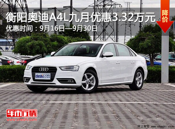 【网上车市衡阳站讯】近日,网上车市网站从华源奥迪衡阳4S店获悉,2014年9月16日—9月30日,奥迪A4L最高优惠3.32元。奥迪A4L将一切予以完美平衡:强劲动力与极致能效相得益彰,锐意设计丝毫不掩超前科技的耀目光芒,而舒适空间令前所未有的精准操控倍感惬意。令您从生活到事业,无不尽享跃级人生。