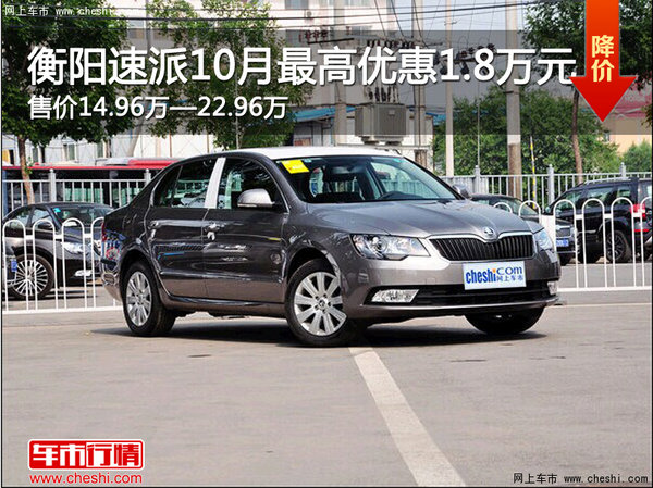 【网上车市衡阳站讯】速派作为斯柯达旗下的旗舰车型,速派全系搭载了大众先进的TSI发动机,及同样出自大众的中级车底盘,无论是动力性、操控性还是舒适性与同级别车型相比均占有明显优势。近日,网上车市编辑从衡阳斯柯达高瑞4s店获悉,2014年10月12日—10月15日,斯柯达速派最高优惠1.8万元,感兴趣的朋友可以到店咨询。