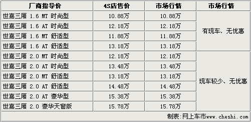 笔者从北京地区经销店了解,目前世嘉三厢有1.6时尚版和舒适版自动档现车供应,主要有银色、红色等可供挑选,现车颜色不全。2.0排量均需要预订,订金为2000元,20个工作日便可以提车。自上市以来,全系车型仍没有出现现金方面优惠。
