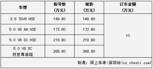 近日,编者从深圳路虎4S店获悉,由于刚上市不久,2010款揽胜目前店内全系暂无现车,展厅只有样车可供消费者观看。不过现在店内可以接受预定,定金10万元,需等待2个月左右方可提车。如果想获得更多优惠请联系我们:23985795、33002601