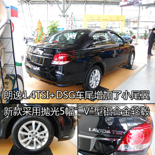 朗逸1.4TSI+DSG车型的车尾改变多了一根小尾翼。新款抛光5幅”V"型铝合金轮毂取代了原有的7幅铝合金轮毂,至于轮胎则没有变化,采用的仍是205/55R16的米其林轮胎。