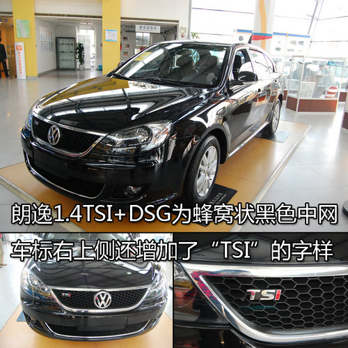 朗逸1.4TSI+DSG车型在外观上和目前市面上销售的1.6L与2.0L朗逸车型相比区别不是太多。从车头上看,蜂窝状黑色中网取代了原有车型上带有横向镀铬饰条的中网,增加了“TSI”的字样。与黑色蜂窝状中网相搭配,使整车看上还真多了几分运动气息。