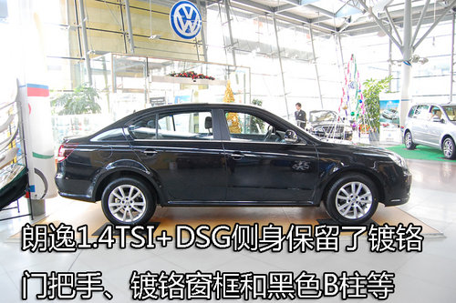 车身的侧面,原来朗逸中高配车型上那些镀铬门把手、镀铬窗框和黑色B柱等在这台1.4TSI+DSG车型上还是得到了保留。