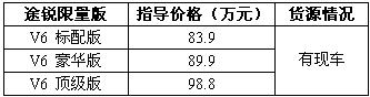 随着2010虎年的到来,途锐家族的又一员虎将——限量版问世,这也是大众进口汽车献给中国途锐粉丝们的新年礼物。它的问世,成就了途锐家族的又一个巅峰。近日,笔者从深圳进口大众经销商华熙汽车了解到,途锐限量版已经到店,现车比较充足,售价为73.00-83.00万元,颜色以黑色为主。由于属于限量版车型,数量有限,因此暂无现金优惠。详情可咨询:23985795、33002601,详情见下表: