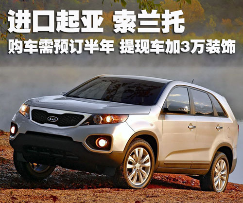 据进口起亚4S店销售人员介绍,新索兰托订单持续增加,如客户着急提车,需在店内加装3万元装饰,装饰包括:脚垫、贴膜、地胶、封釉、加不锈钢保险杠等。预订需要交纳1万元订金,6月份可提到现车。现车颜色根据近期到车颜色而定。
