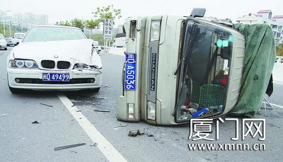工作昨日上午9时许,成功大道与吕岭路相交的高架桥上,一辆宝马车将违章上成功大道行驶的小货车撞翻。