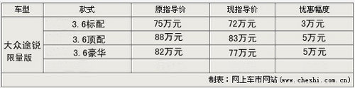 近日,网上车市编辑从天津港保税区长泰国际贸易有限公司获悉,途锐限量版已全面上市,已经开始接受预订,1月底现车即可到店。价格方面,商家在指导价基础上给出最高达5万元的现金优惠。具体情况如下表:
