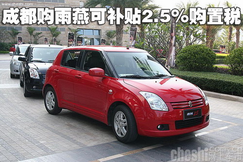 网上车市讯:来自成都建国长安铃木4S店的消息,目前店内针对雨燕正在进行购车补贴2.5%购置税的促销活动,雨燕全系除超值版以外均可获得此项优惠,此外,现在起到店购车就送礼,还有机会抽取佳能单反相机、苹果MP4、日本北海道双人游等好礼:
