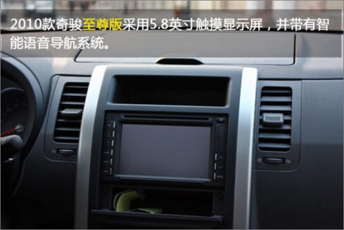 奇骏2010款全车系音响系统升级为数码6碟高保真剧院CD+Audio音响系统,并新增了一款奇骏至尊版,拥有车身包围套装、5.8英寸彩色触摸显示屏、智能语音导航系统、高保真剧院音响系统、侧可视系统、倒车影像监视系统、可伸缩行李厢遮物帘等七大亮点配置。在银色、黑色等颜色的基础上,奇骏2010款还增加了玛瑙红车色,更显时尚、动感。