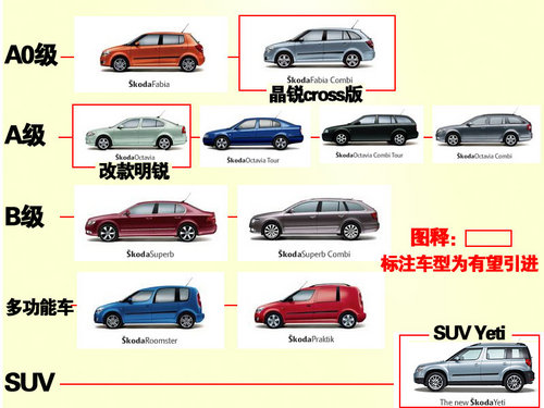 目前斯柯达旗下拥有7个系列以及衍生的11款车型,如上图所示其中的老款明锐、晶锐轿车、昊锐已经引入。而一些类似Wagon感觉的旅行版车型,在中国市场中还没有太多厂商敢于涉足,因此相信未来轿车和SUV才是斯柯达引进车型的首选方案。