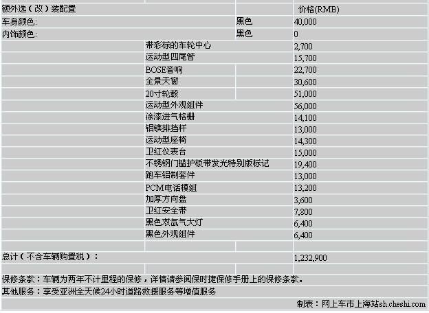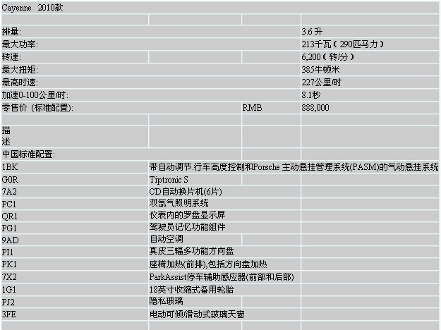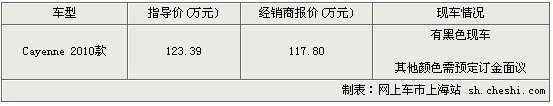 保时捷贯彻他的新宗旨:高性能低油耗,更经济更环保。 保时捷卡宴凭借它出色的性能在国内外都很吃得开,而新一代卡宴现在也亮相了。据网上车市编辑上海瑞宏汽车销售店了解,2010卡宴已到店,有黑色现车现金优惠,其他颜色需预定。具体情况见下表: