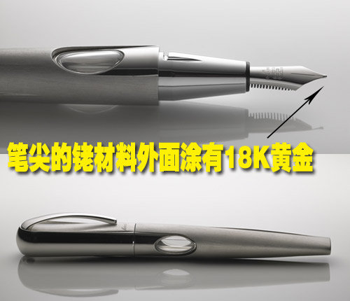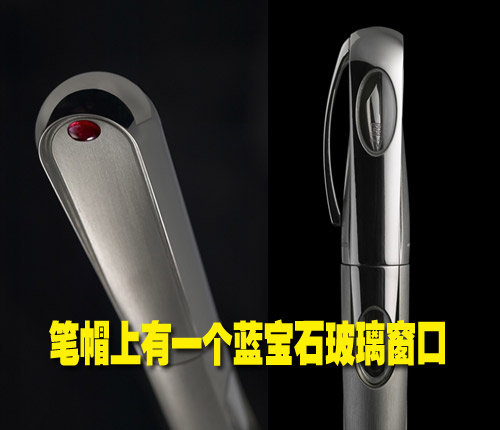 笔尖是由铑材料外面涂上18K黄金制成的,笔帽上有一个蓝宝石玻璃窗口,里面是黑色浮雕制作的布加迪标志。外观上的奢华和材料的精挑细选和布加迪也有几分相似之处。
