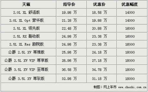 新一代天籁以日产高级轿车D平台为基础,汇聚日产全球先进技术精心打造而成。本站记者由石家庄华信日产了解到,截止到1月底新天籁有最高18000元的现金优惠。感兴趣的消费者可以与经销商联系,具体详情请看下表: