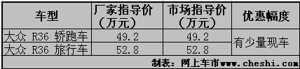 近日,编者从进口大众经销商了解到,目前深圳地区大众R36有少量现车,价格上没有优惠。喜欢改车型的朋友得抓紧了。想了解更多行情,请咨询:33002601