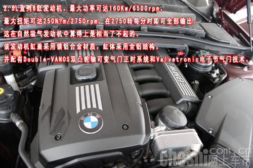 在动力配置方面这一批进口3系与国产车型没有任何不同,不过源自德国,似乎在心里上让车主更踏实。2.5L直列6缸发动机,最大功率可达160Kw/6500rpm,最大扭矩可达250N•m/2750rpm,在2750转每分时即可全部输出,这在自然吸气发动机中算得上是相当了不起的。该发动机缸盖采用镁铝合金材质,缸体采用全铝结构。并配有Double-VANOS双凸轮轴可变气门正时系统和Valvetronic电子节气门技术。