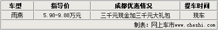网上车市讯:来自成都万友长安铃木4S店的消息,目前购雨燕全系车型可获得3000元的现金优惠加3000元的大礼包赠送,除超值版外其他车型现车充足,购车无需等待: