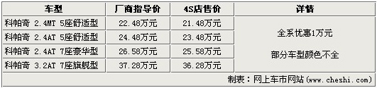 雪佛兰于2009年1月8日,以进口方式引进两款科帕奇新车型,分别是搭载3.2L V6发动机的雪佛兰科帕奇旗舰型,及雪佛兰科帕奇2.4L自动挡5座精英型。两款新车售价分别为372800元及244800元。近期,我们从雪佛兰经销商处获悉,科帕奇现车充足,全系优惠1万元。