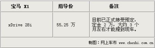 宝马品牌旗下体型最小的SUV-X1已于本月20日正式上市,初期上市的车型为xDrive 28i。本站记者由石家庄宝和宝马4S店最新获悉,目前已经有一台朱砂红的宝马X1 xDrive28i新车到店,售价为55.25万元。目前此款车已正式接受预定,定金2万元,大约3个月左右才能提到现车。感兴趣的消费者可以与经销商联系,具体详情请看下表: