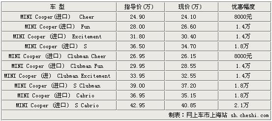 迷你MINI旗下车型经典、活泼可爱的造型已被很多人熟知与认可,在被宝马汽车收购后,又赋予了其出色的动力性与操控性,使这个历史悠久的汽车品牌,不仅以出色的设计闻名于世,在性能方面也可圈可点。据网上车市价格监测显示,现MINI Cooper最高优惠2.1万 ,最低仅售24.10万,具体价格见下表: