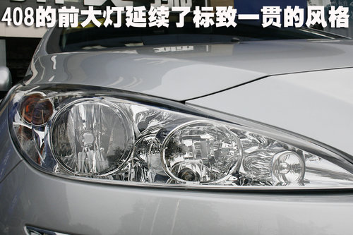 东风标致408在外观上承袭了标致家族的特征,整体设计风格大气时尚,尤其前部大嘴设计以及硕大的大灯都已成为标致独有的气质,车身喷漆与各模具制造质量均属上乘。大灯与发动机盖、水箱框架之间的缝隙比较均匀,漆面光洁度十分不错。