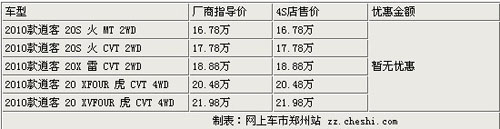2010款逍客在原来车型基础上对配置以及车型进行了全面升级和优化,为消费者提供了最准确的满足市场需求的选购空间。根据网上车市价格监测系统显示,目前2010款逍客暂无优惠。具体车型价格如下: