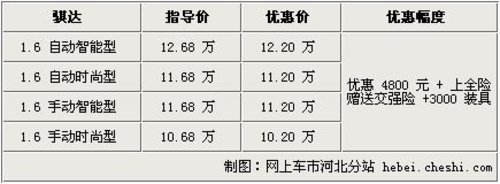 骐达凭借其空间、动力、省油、安全紧凑型车四大标准赢得了众多消费者的青睐,树立了紧凑型车的标杆,销量一直很高,而且一直非常稳定。网上车市价格监测系统显示,石家庄地区骐达全系有4800元的现金优惠。具体详情请看下表: