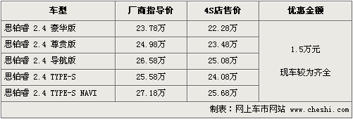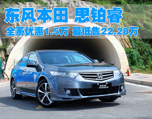 东风本田思铂在09年9月初上市,全系共计五款车型,售价为23.78万元—27.18万元。上市后一直备受关注,订单和销量也持续增加。根据网上车市价格监测系统显示,目前思铂睿的优惠幅度进一步加大,全系可优惠现金1.5万元。具体车型行情如下:
