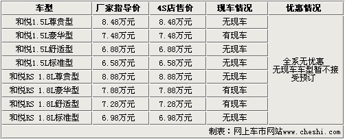 据4S店销售人员介绍,和悦三厢版目前只有售价7.48万元的豪华版车型有现车,RS两厢版有两款车型有现车,分别为售价7.88万元的豪华版和售价7.28万元的舒适版,三款车型均无优惠。由于厂家未给出具体到车时间,无现车车型暂时也不接受预订。