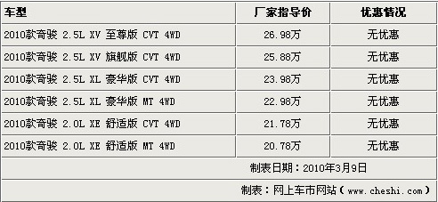 近日,编者从沈阳东北汽贸专营店获悉,刚上市不久的2010款奇骏正在热卖中,现在东风日产奇骏全系车型无优惠。 具体价格见下表: