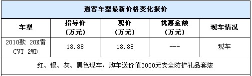 近日,网上车市武汉站编辑从武汉三环华通4S店获悉,东风日产逍客2010款20X雷 CVT 2WD目前店内有红、银、灰、黑色现车,购车可赠送价值3000元的安全防护礼品套装。