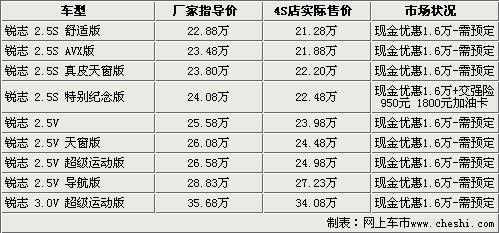 丰田锐志作为一款以运动著称的后驱中级车,在性能以及操控各方面表现都令人满意,尤其是独具个性的改装潜力,让很多痴迷运动的车迷们找到了充分的驾驶乐趣。锐志的原车型是在日本广受好评的“MARK-X”系列,国产后的锐志同MARK X一样配备有2.5L和3.0L两种排量的发动机,同时超长的轴距设计让乘员的空间也有了非常理想的状态。近日根据网上车市价格监测系统显示,目前购买锐志车型,全系均可以获得1.6万元的现金优惠。具体车型见下表: