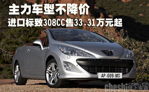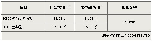 近日,笔者从进口标致广州地区经销商处了解到,目前进口标致308CC仅有时尚真皮版和豪华版,其中,时尚真皮版售价为33.31万,比没有真皮的时尚版贵了1.33万,而豪华版目前售价为35.08万。由于308CC是进口标致中最畅销的车型,因此目前购买仍然没有现金优惠。