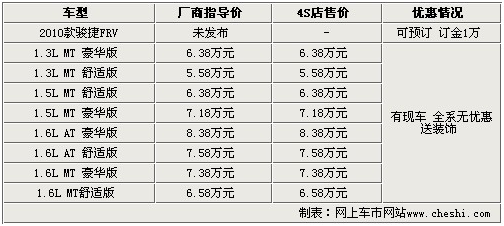 据华晨汽车4S店销售人员介绍,2010款骏捷FRV目前尚未到店,如果对新车型感兴趣可以提前预订,订金为10000元,到车时间和具体价格暂时还不清楚。老款骏捷FRV车型目前现车比较齐全,全系无优惠,如到店购车可以送部分装饰。该销售人员还介绍,伴随2010款骏捷FRV上市,在售的老款FRV有可能停产,暂时还未收到具体的通知,预计停产的可能性较大。