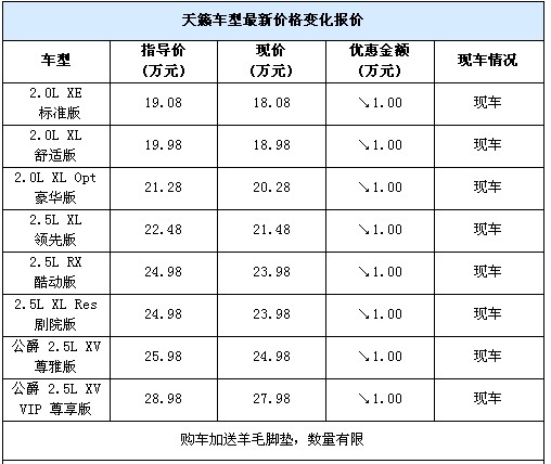 近日,网上车市武汉站编辑从东风日产武汉开泰专营店获悉,目前天籁2.0L和2.5L现车都有1万元的现金让利,另加送羊毛脚垫。具体详情见下表: