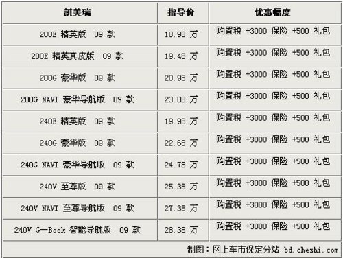 作为中高级车市场的标杆车型,凯美瑞一直以高安全性而著称,不管是在被动安全还是主动安全方面,都拥有领先的实力。近日2010款凯美瑞的推出,又将演绎车市新价值。近日网上车市价格监测系统显示,目前保定地区购买09款凯美瑞暂无现金优惠,现在购车可获赠全额购置税+3000保险+500礼包。具体详情请看下表: