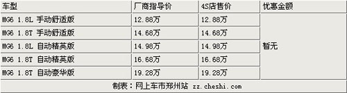 MG6是上海汽车第一款面向全球市场设计、生产和销售的自主开发新车型,它延续了MG品牌“运动”、“激情”的品牌内涵,以见诸各大豪门新品的“Fasback”设计美学引领最新国际流行趋势。近日根据网上车市价格检测系统显示,郑州地区购买MG6暂无优惠,具体车型价格请见下表: