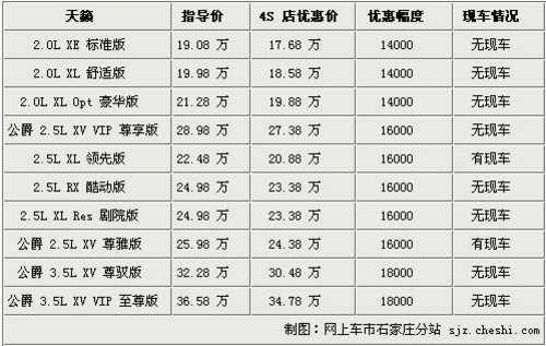 相比德系车型的严谨,日系车的风格则更为细腻。比如说东风日产天籁,这款车从外观设计上时尚而沉稳,内饰上你能够体验到同级别车型中无法比拟的舒适感,商用和家用两者皆可。近日根据网上车市价格监测系统显示,石家庄购买天籁最高可以享受到1.8万元的价格优惠。具体车型售价见下表:
