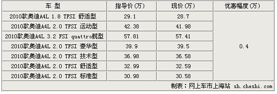 奥迪A4L动力强劲、 配置齐全,内饰多处镀铬装饰更为精致,座椅的舒适度和包裹性都很好,油耗量即使在崎岖的山路上面也很低。它集顶尖的运动性能、超越同级的驾乘空间、树立同级标杆的安全品质和跃级豪华装备于一身,是一款真正将运动与舒适融为一体的中型高档轿车。据网上车上价格监测显示,奥迪A4L现降价优惠0.4万元, 最低仅售28.70万 。具体价格见下表: