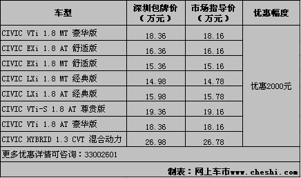 【网上车市】近日,网上车市记者在深圳东风本田经销商处了解到,东风本田思域全系优惠2000元,其中东风本田思域MT经典版最低仅售14.78万元。店内现车充足,想了解更多东风本田系列车型的优惠可咨询:33002601,详情请见下表: