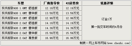 东风标致408车型于2010年1月25日在北京全球首发,正式上市。推出的新车共包括两个排量七款车型。编辑也从东风标致经销商处了解到,东风标致408试驾车现已到店,并接受预订。详情请见下表: