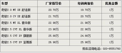 东风日产城市SUV奇骏有着比竞争对手更强的动力和更出色越野性能而广受消费者关注。搭载2.5L发动机和CVT变速箱让它拥有强劲动力的同时,油耗也很经济。近日根据网上车市价格监测显示,目前购买2010款奇骏全系可以享受到1万元的现金优惠,目前店内2.5L车型现车充足,2.0L现车比较紧张,部分车型购买需要预定。具体车型售价见下表: