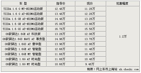 东风日产的两款主力经济型轿车骐达、颐达于05年上市,并于07底、08年初两款车完成了小改款及升级方案,凭借其宽敞的车内空间以及出色的动力性能博得了不少消费者的喜爱。根据网上车市价格监测系统显示日产骐达-降价优惠1.2万元 ,最低售9.48万。具体价格见下表: